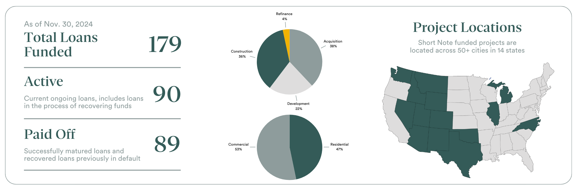 Our Short Note Portfolio funds a variety of real estate develepment projects throughout the country that vary in project size and type, allowing you to invest into real estate properties without getting involved directly in the ownership of a property. As the borrower makes their payments on the loans, you get your interest on your short notes!